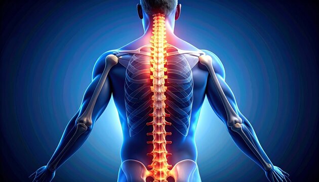 Digitally rendered human figure from back with glowing orange-yellow spine—set against blue-toned body, emphasizing spinal structure and health.