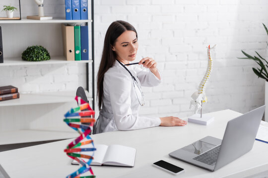 Doctor pointing at shoulder near spinal model during video call on laptop in clinic