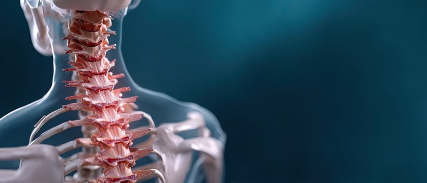 A close-up view of a human spine model, highlighting its vertebrae structure with vibrant colors against a blue background.