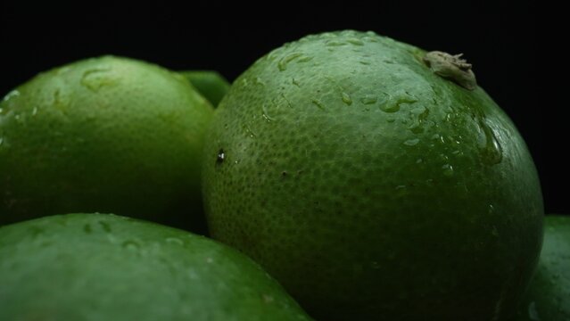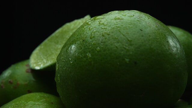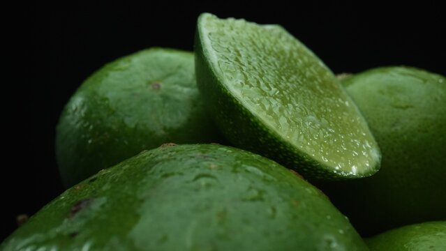 Slices of lime are meticulously arranged in a pile, set against a black background. Each lime slice is captured in stunning detail, its vibrant green hue and enticing texture. Close up. Comestible.