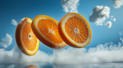 Sliced orange spinning mid-air, surrounded by misty freshness, deep blue sky and white clouds in the background, product photography, vibrant colors, dynamic shot