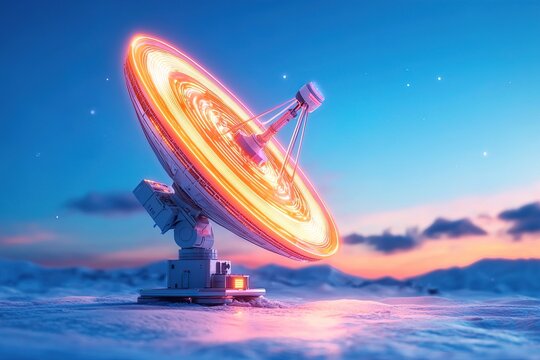 A futuristic satellite dish spinning in a colorful sky at twilight, surrounded by mountains.