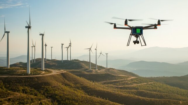 A drone inspecting a wind farm, vast landscape with spinning turbines and real-time performance data on digital screens, High-tech style