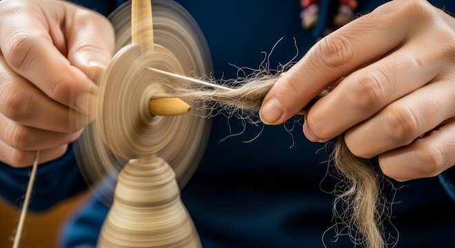 Artisan hands spinning wool with a spinning wheel in a cozy setting