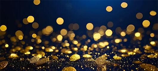 Abstract golden particles or gold foil texture with a bokeh effect on a dark blue background