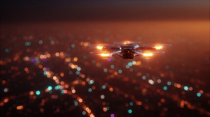 Drone flying over a city at night. the drone is in the center of the image, with its four propellers spinning rapidly. the city below is lit up with colorful lights, creating a bokeh effect.