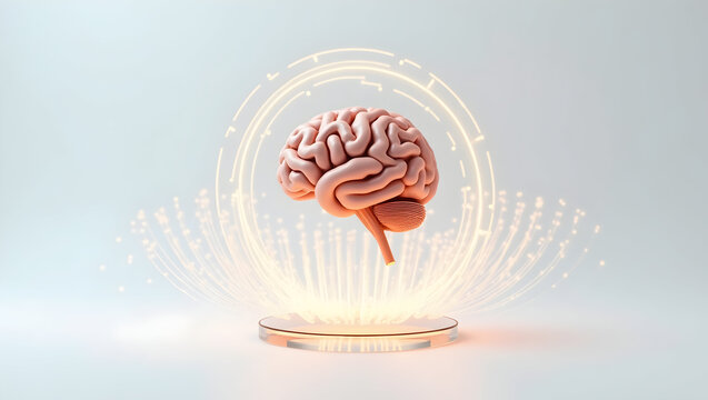 A glowing, translucent model of a human brain hovers above a futuristic, circular platform with orange lights, set against a dark background with circuit patterns, representing artificial intelligence