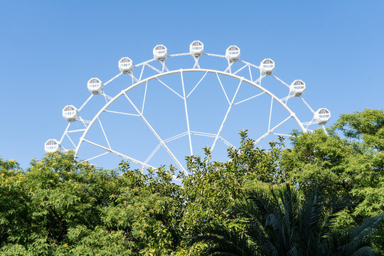 Vibrant wind turbine spins amidst blossoming cherry trees against a clear blue sky, wind turbine spinning against the background of a flowering tree