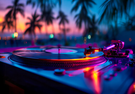 A stunningly vibrant sunset casts a warm glow over a turntable, enhancing the atmosphere of a lively tropical evening music session on the beach