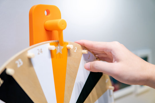 Male hand spinning wooden wheel of fortune. Luck and risk game. Entertainment gaming concept