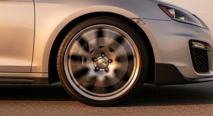 Silver sports car in motion with blurred spinning wheel on asphalt road