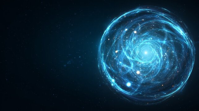 Luminous blue particle vortex spiral around dark cosmic void with glowing bokeh lights