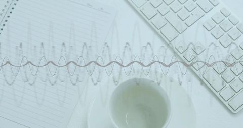 Minimal flatlay workspace featuring ceramic cup, notebook, keyboard and soundwave overlay