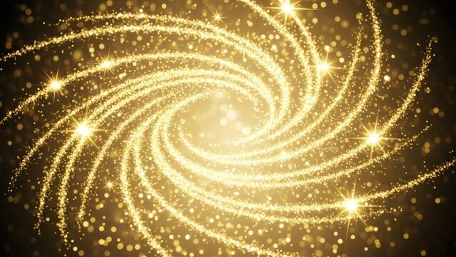 Abstract golden spiral of sparkling light trails and glitter particles creating a magical galaxy effect on a dark background