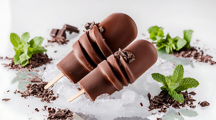 Chocolate popsicles arranged in a loose spiral, surrounded by miniature mint bouquets and scattered dark chocolate shavings, all resting on crushed ice over a reflective white base,