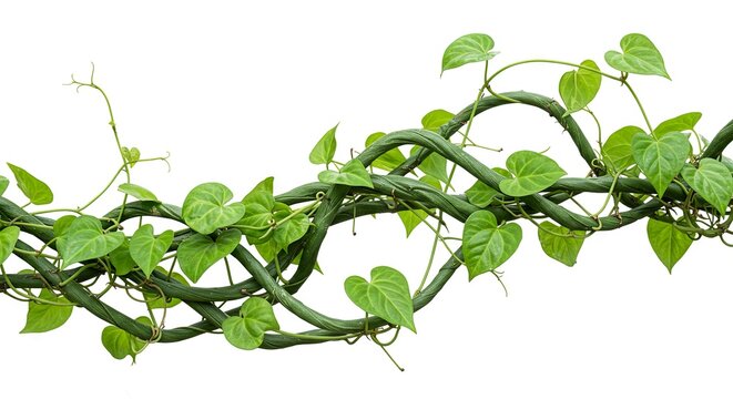Lush green vine spirals with heartshaped leaves against a white backdrop