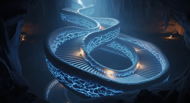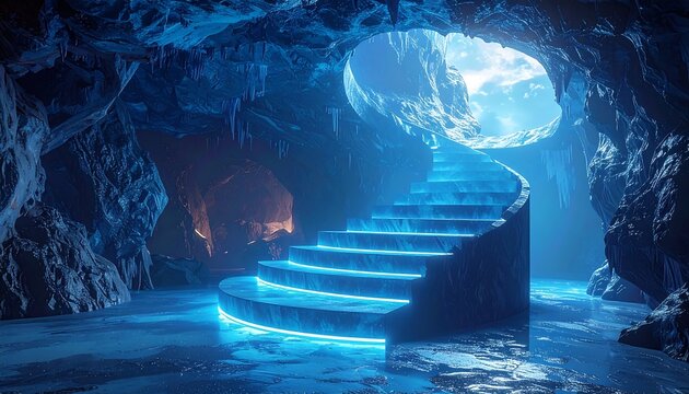 Glowing spiral staircase in icy cave.