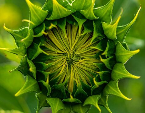 A close-up view capturing the intricate, spiraling structure of a sunflower bud, showcasing its vibrant green and yellow hues