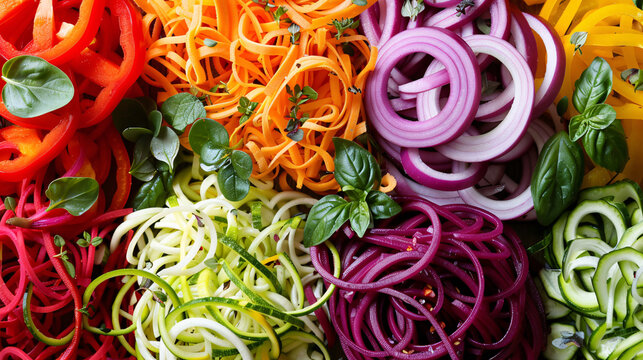 Colorful variety of fresh vegetables being spiralized