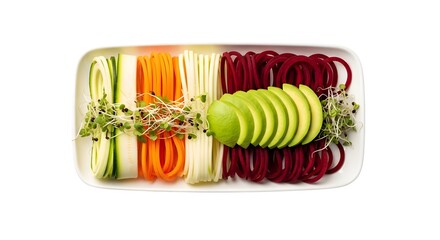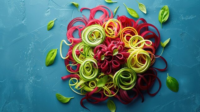 An artistic composition of spiralized cucumber and beetroot noodles forming a colorful mandala, symbolizing holistic wellness