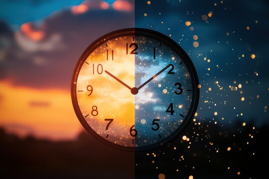 Split image shows day, night sides of daylight saving time. Clock in center of meadow with mountains background. Sunrise, sunset illustrated by vibrant colors. Nature transition concept. Peaceful