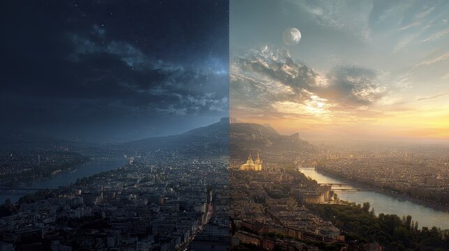 Split landscape showcasing a cityscape transitioning from day to night.