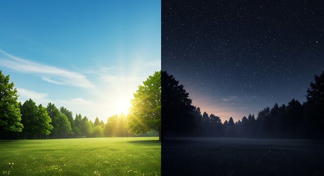 Vibrant day and starry night split of a serene park landscape