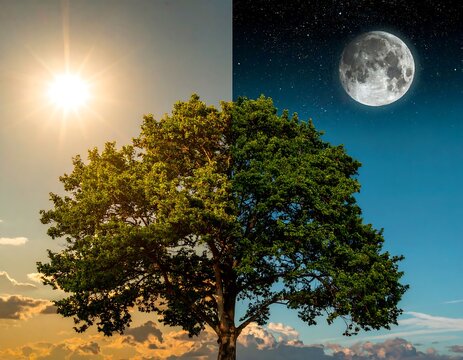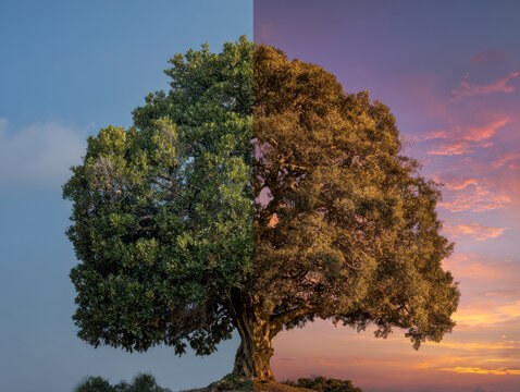 Tree divided between day and night with vibrant green leaves under clear blue sky and warm sunset hues casting golden light on the branches and landscape below