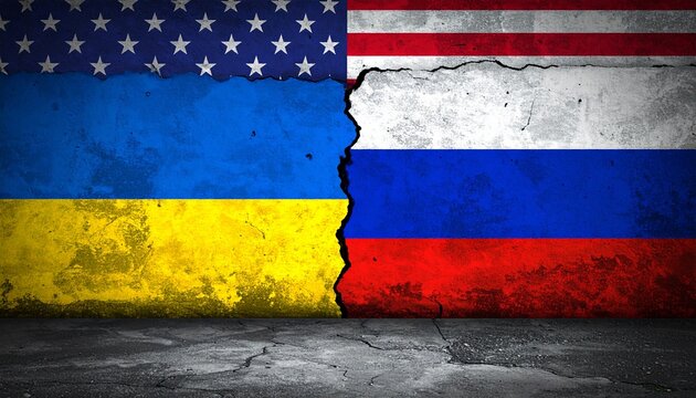 Merged U.S.–Ukraine flag split from Russian flag by a jagged crack on a concrete background.