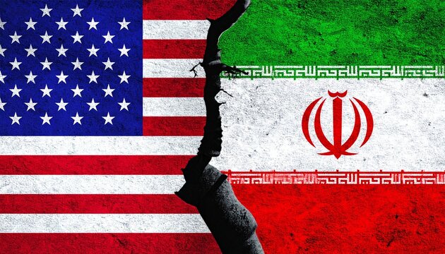 Split US and Iran flags with jagged crack symbolizing division and geopolitical tension.