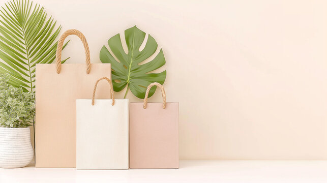 Three shopping bags beside plants and a split leaf philodendron leaf. Perfect for retail promotions or environmental awareness campaigns.