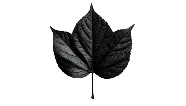 A dark, stylized monochrome leaf, split vertically, isolated against a black background