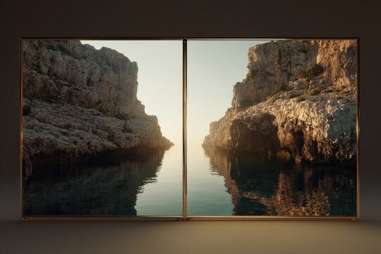 Split-screen image of a rocky coastline with calm water