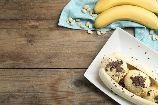 Delicious banana split ice cream on wooden table, flat lay. Space for text