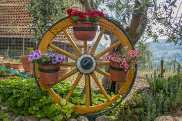Spinning wooden wagon wheel rolling on dusty road kicking up dust with bare feet