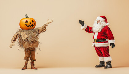 Scarecrow with Halloween pumpkin head and Santa Claus waving hello to each other, scarecrow is on the left side and Santa Claus is on the right side of the picture, beige background, copy space