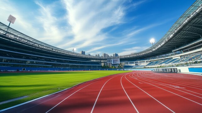 Close-up view of a red running track with white lane markings in a stadium under bright lights, concept for sporting events, athletic competitions and physical training