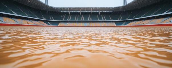 A large stadium filled with water, reflecting the overcast sky, showcasing the impact of heavy rainfall on sports facilities.