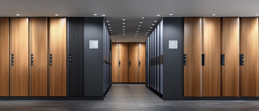Modern wooden and stone locker room design showing empty shelves in a sports club dressing area with spotlight lighting