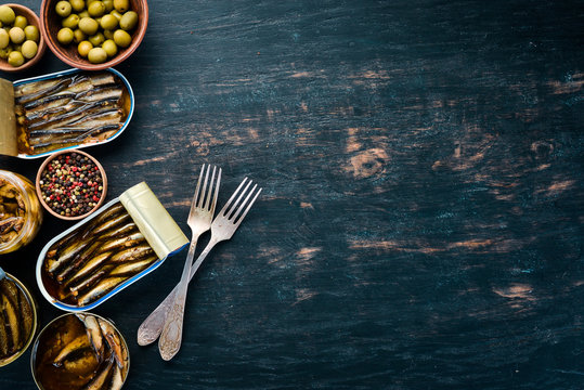 Assortment of sprats in oil. Smoked fish On a black background. top view. Free copy space.