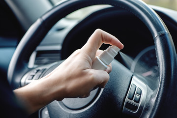 male hand spraying disinfectant spray on your smartphone screen inside the car