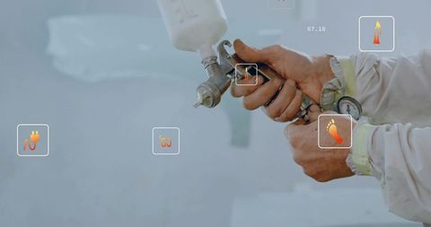 Automotive painter spraying car parts in manufacturing facility