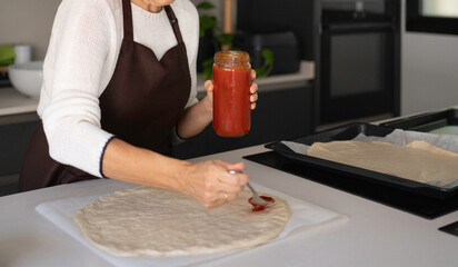 Woman in apron spreading tomato sauce on pizza dough in a modern kitchen setting