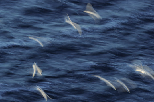 White birds fly over blue sea in motion blur
