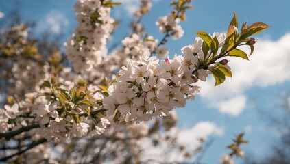 White blossoms dance on verdant leaves, whispering spring equinox secrets; symbols of Hanami and hidden fairy realms
