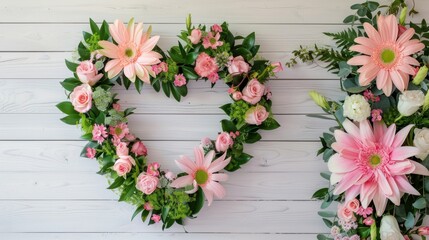 A beautiful heart shaped floral arrangement showcases pink blooms and lush greenery, ideal for gifts or decorations at special events