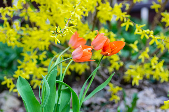 Vibrant orange tulip bouquet in spring garden with yellow forsythia background.