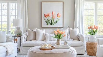 Here's a description and keywords for your stock photo.. Sunlit modern living room with large windows, white sectional sofa, colorful pillows, and spring flowers.