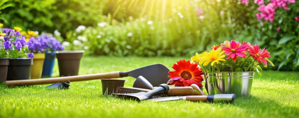 Set of garden tools and pots with plants and beautiful colorful blooming flowers, sunlight coming through, spring garden scene with blurred background and copy space for text