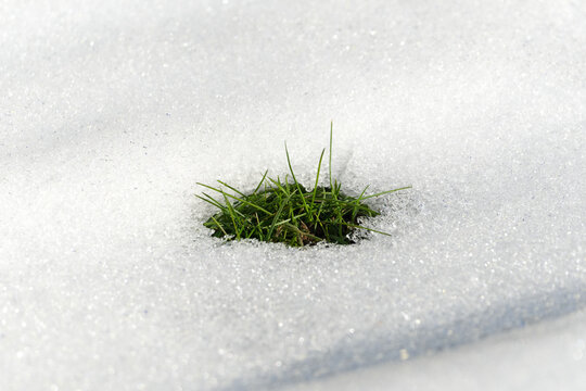 Melting snow with first green grass leaves emerging, concept of thaw and coming spring